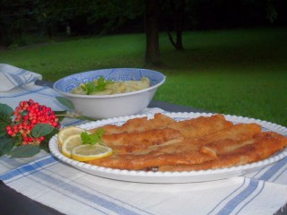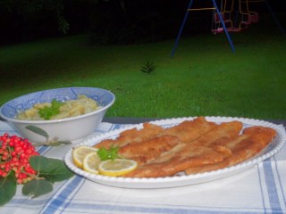 Сервирам готовите панирани филета топли, с резенчета лимон и Баварска картофена салата.