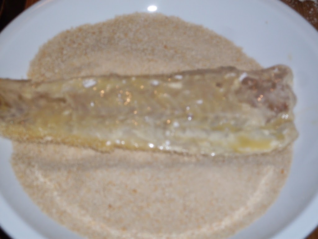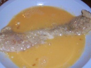 - Потапям в предварително разбитите яйца. Изцеждам филето от излишното яйце.