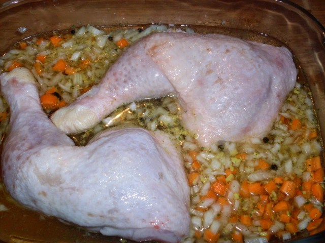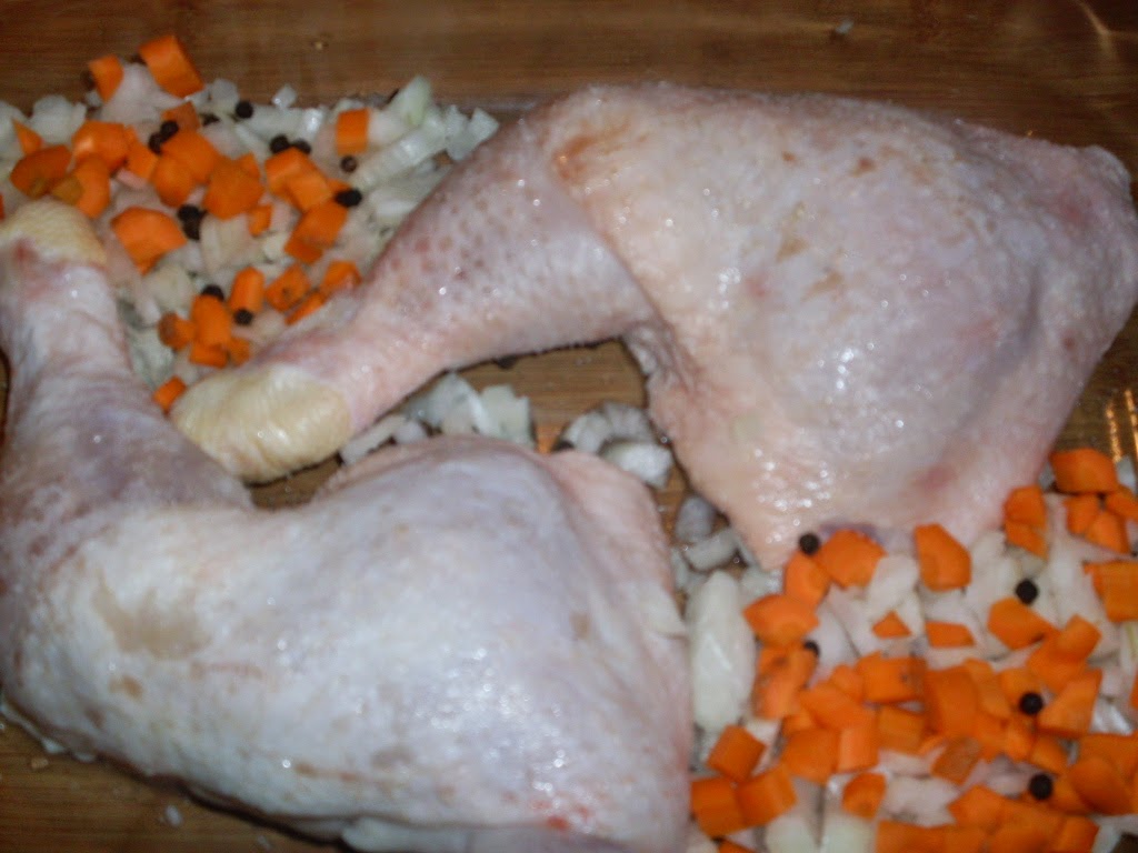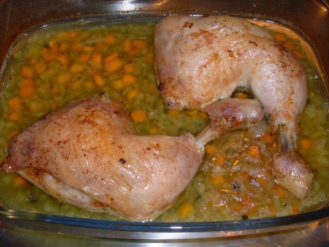 - Подреждам ситно нарязаните зеленчуци, заедно със зърната черен пипер, около пилешките бутчета.