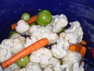 - Подреждам всички зеленчуци в тенджерата и заливам със солената вода.