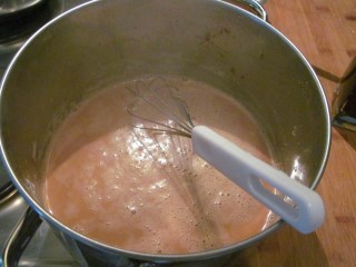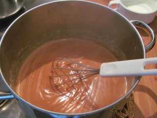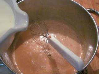 - Добавям горещото прясно мляко и разбърквам. Тук трябва да се пазите от изгаряне, защото млякото започва много силно да бълбука. Задължително да се отстрани тенджерата от котлона.