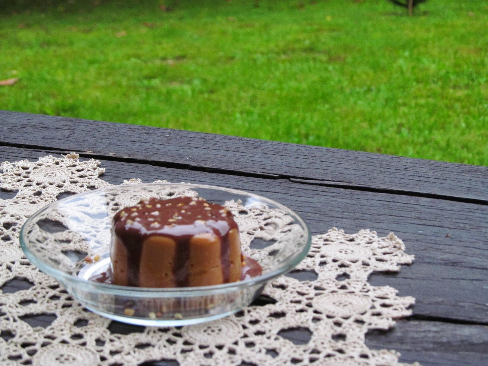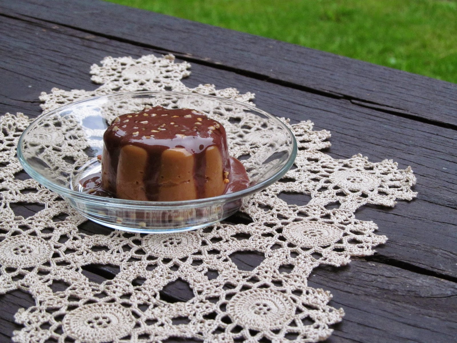Заливам със студен шоколадов сос и поръсвам с лешников крокант.