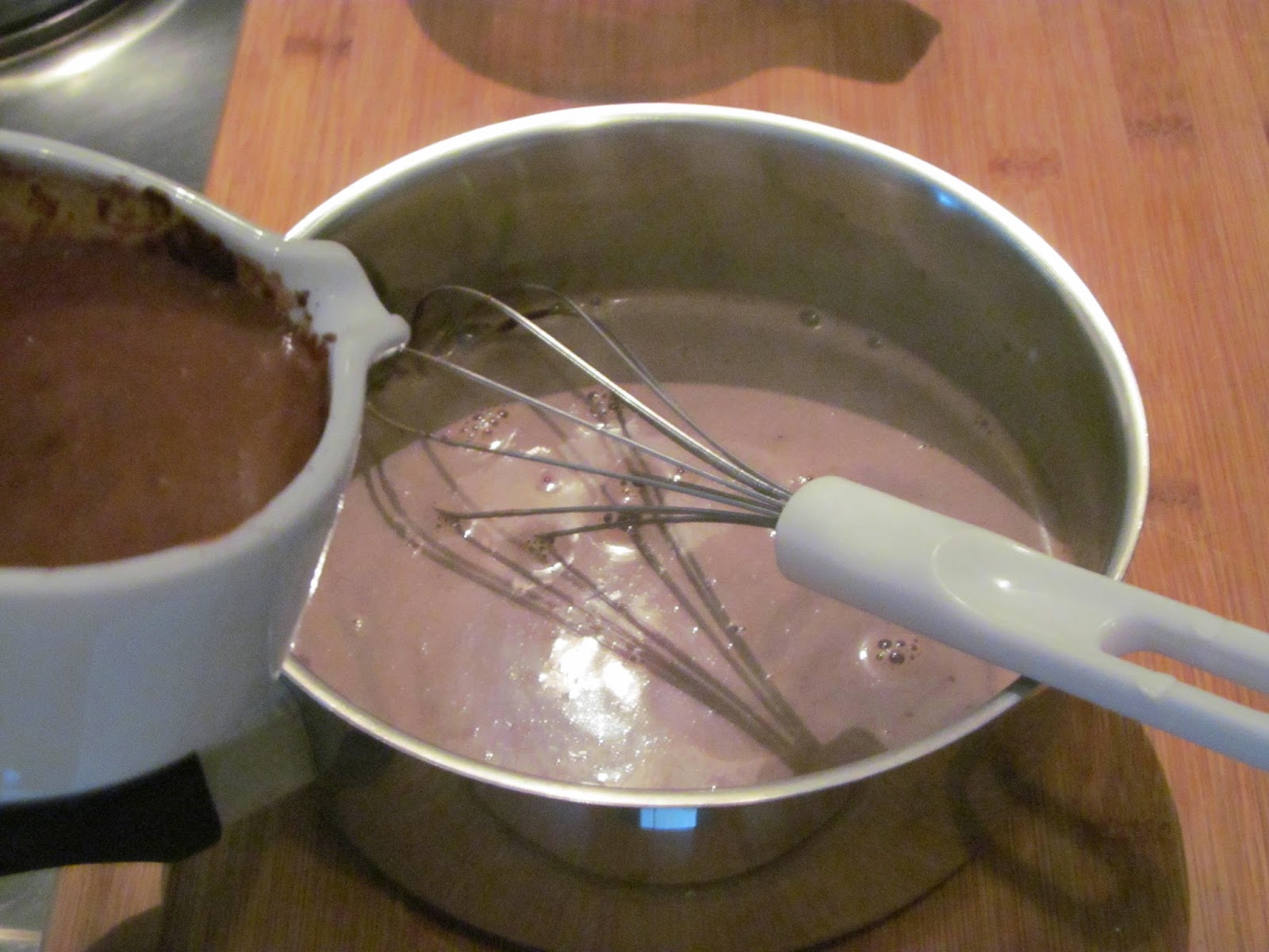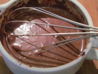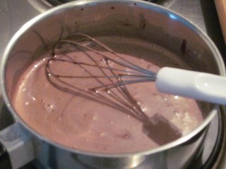 - Когато млякото заври, отделям от котлона и с постоянно бъркане малко по малко добавям от какаовата смес.