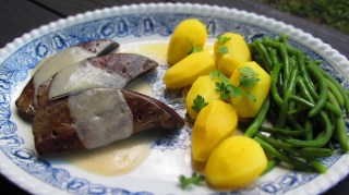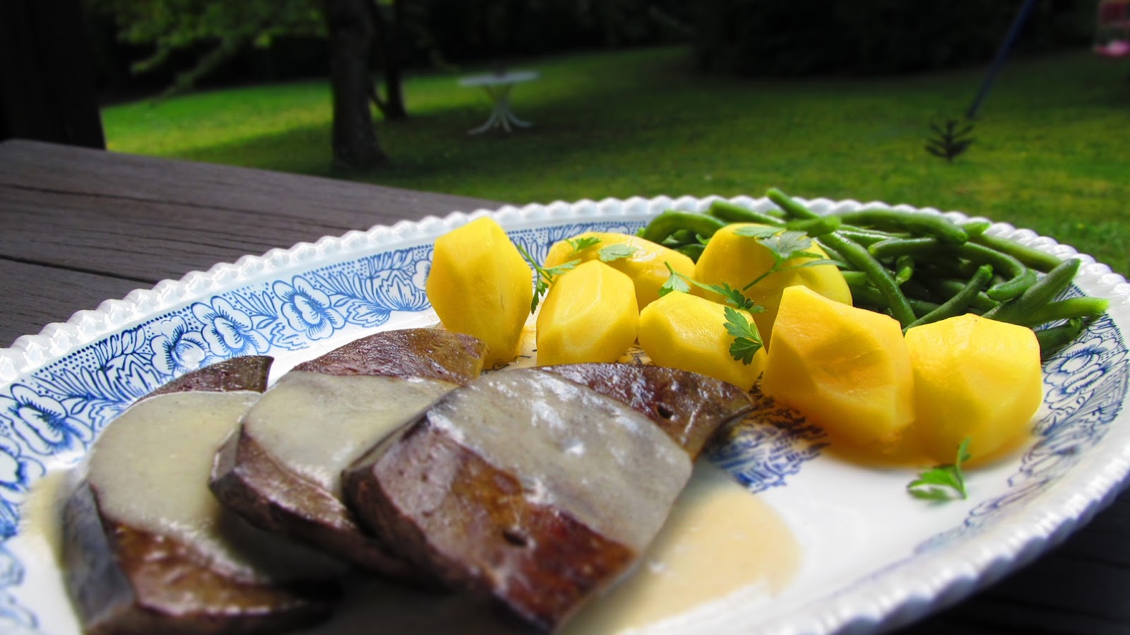 Сервирам няколко парченца черен дроб, поляти с пикантен сос, варени картофи и зелен фасул за гарнитура.