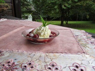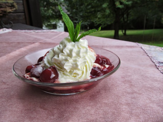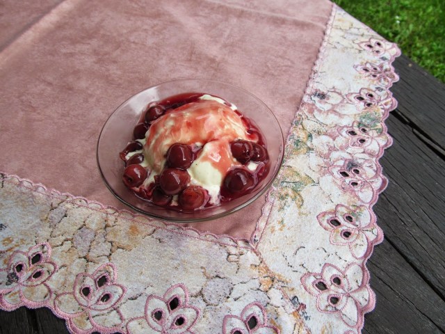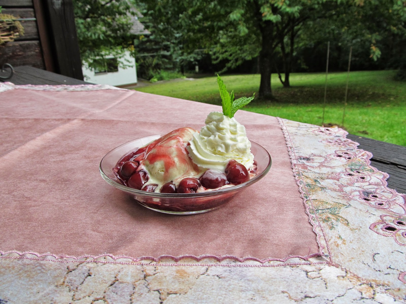 За първи път опитах сладолед, поднесен с горещ черешов сос в Германия. Бях приятно изненадана от вкуса на този десерт. Комбинацията мужду ванилов сладолед и този горещ сос, гарниран със сметана е наистина невероятна. В същото време това е един много лесен и ефектен десерт, особено ако не разполагате с достатъчно време за подготовка, при посрещането на гости.