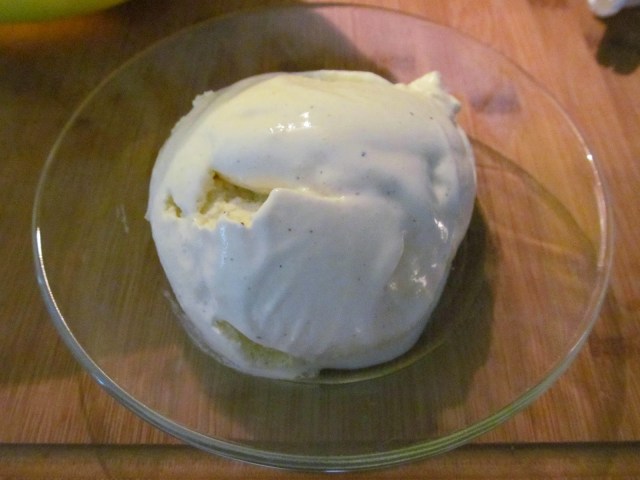 - С помощта на черпак, оформям топка от ваниловия сладолед. Ако разполагате със специалната лъжица за оформяне на топки сладолед – още по-добре. Можете да оформите 2 или три топки сладолед на порция.