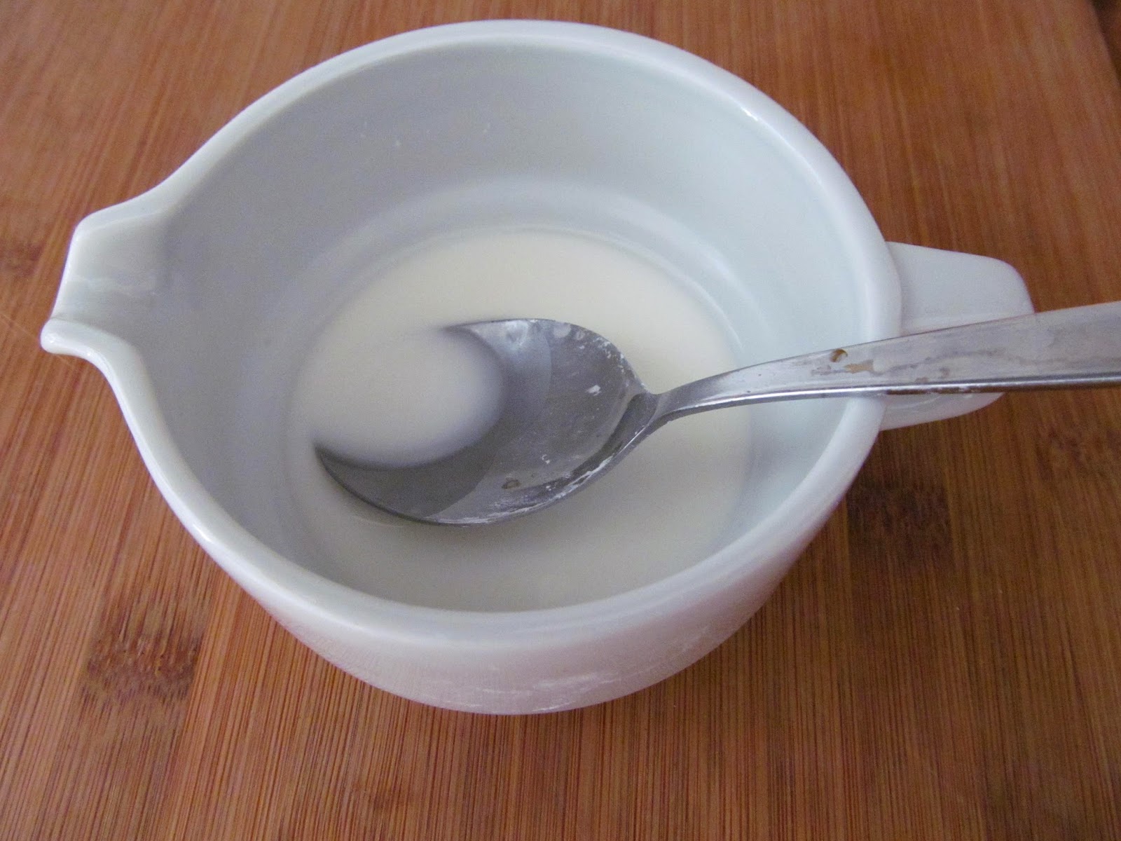 - Заливам нишестето с малко вода /около 50 мл/ и разбърквам, докато се получи гладка кашичка.