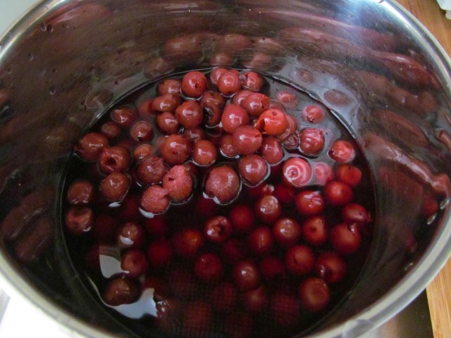 - Изсипвам компота с череши в подходяща по размер тенджера, добавям захарта и ванилията и слагам на котлона, на максимална степена да заври.