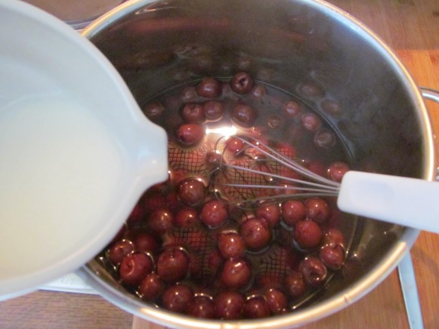 - Щом компотът заври, отстранявам от котлона и с постоянно разбъркване добавям към него разтворенето нишесте.