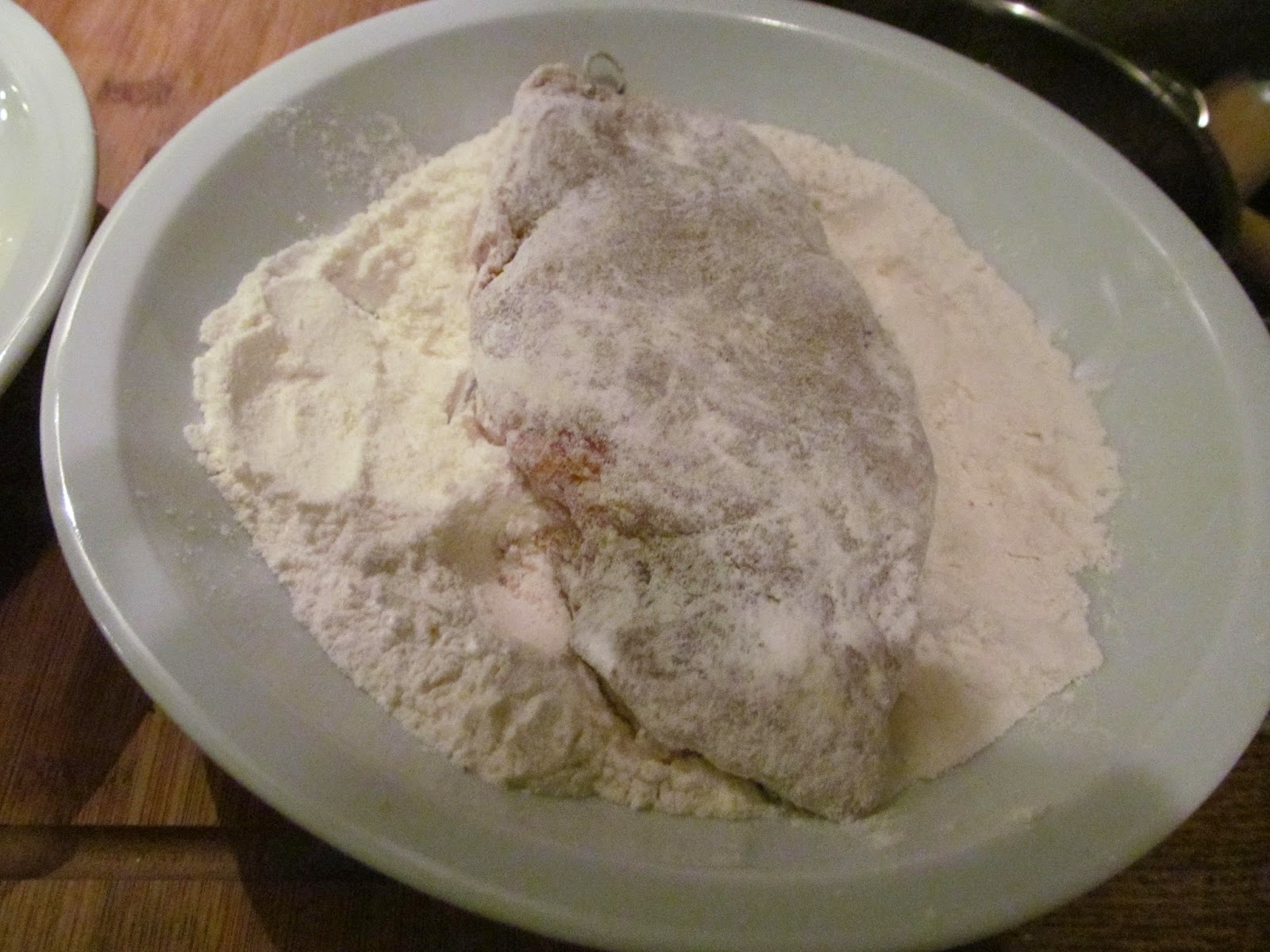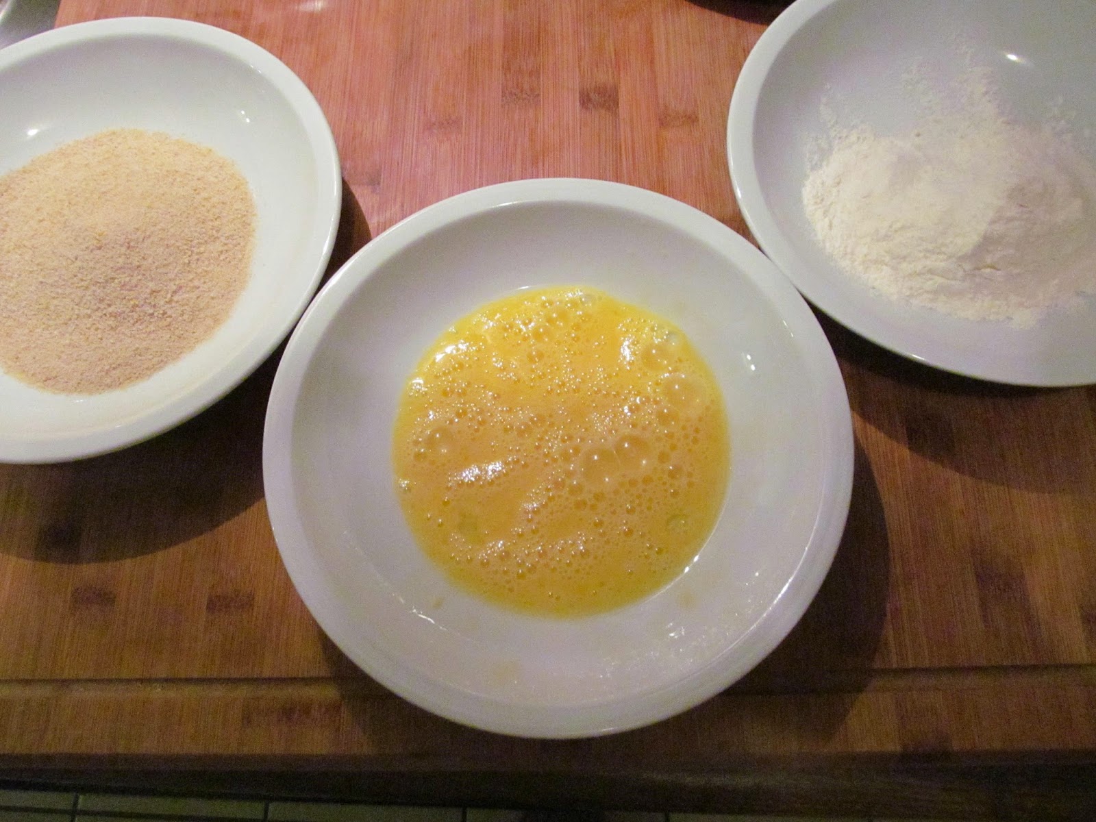 - Подготвям си в три отделни чинии панировката – брашно, разбито яйце и галета.