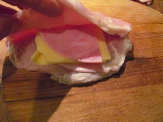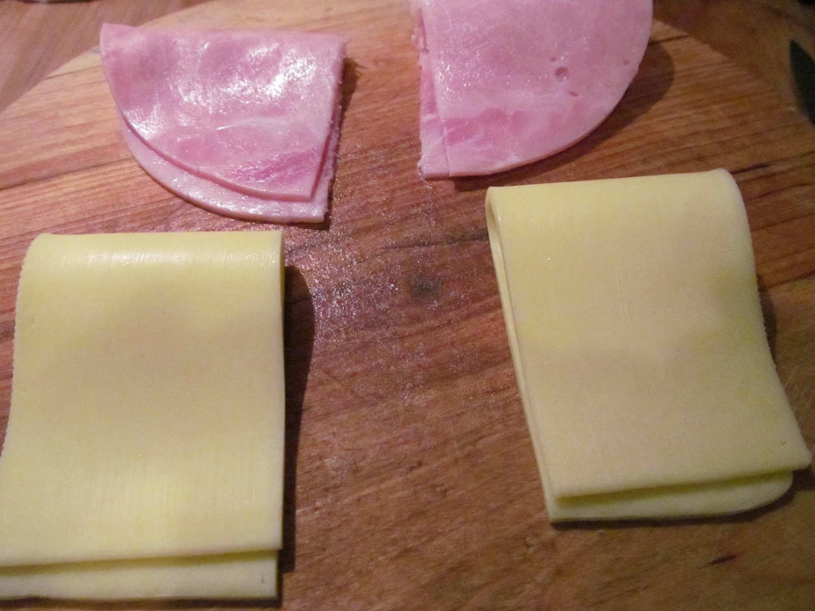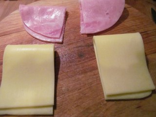 - Парчета шунка и кашкавал сгъвам на половина и отрязвам на две парчета.