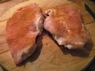- Поръсвам обилно двете кордон бльо с подправки. Това може да е само сол и черен пипер, или пък пикантина за барбекю.