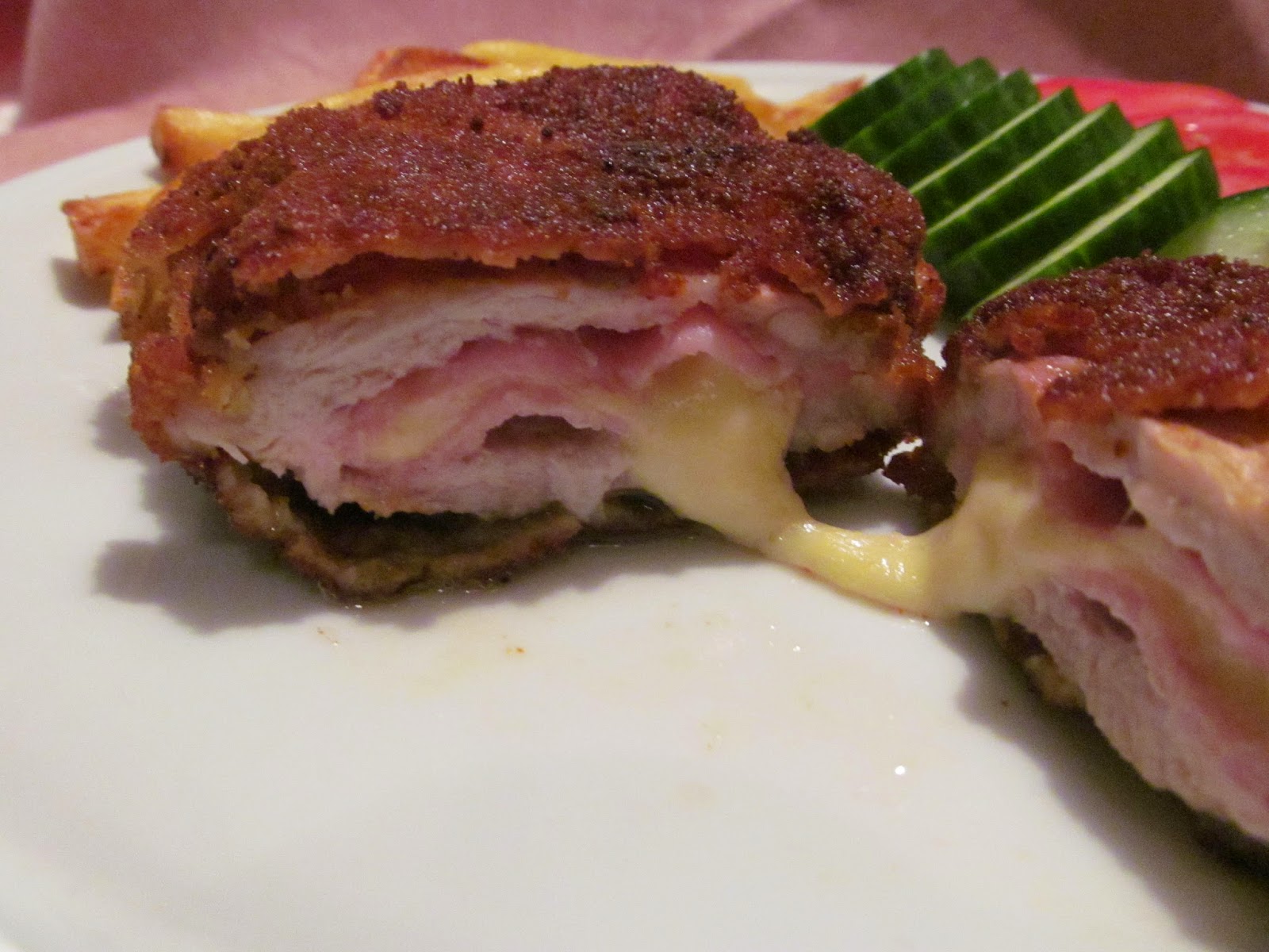 - Пърженето на кордон бльо от свинско месо продължава около 10 минути на слаба температура. През цялото време обръщам по няколко пъти, за да се зачерви равномерно от двете страни.