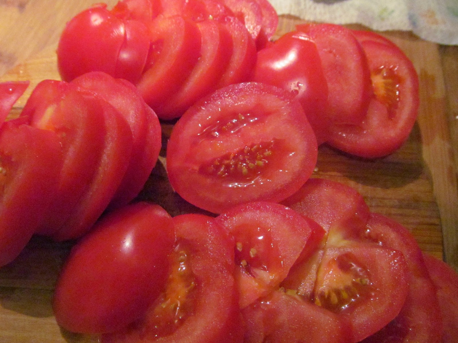- Патладжаните измивам добре, нарязвам на кръгчета и оставям върху домакинска хартия, леко посолени, за около 15 мин. Преди изпържването им, подсушавам получилите се капчици с домакинска хартия.