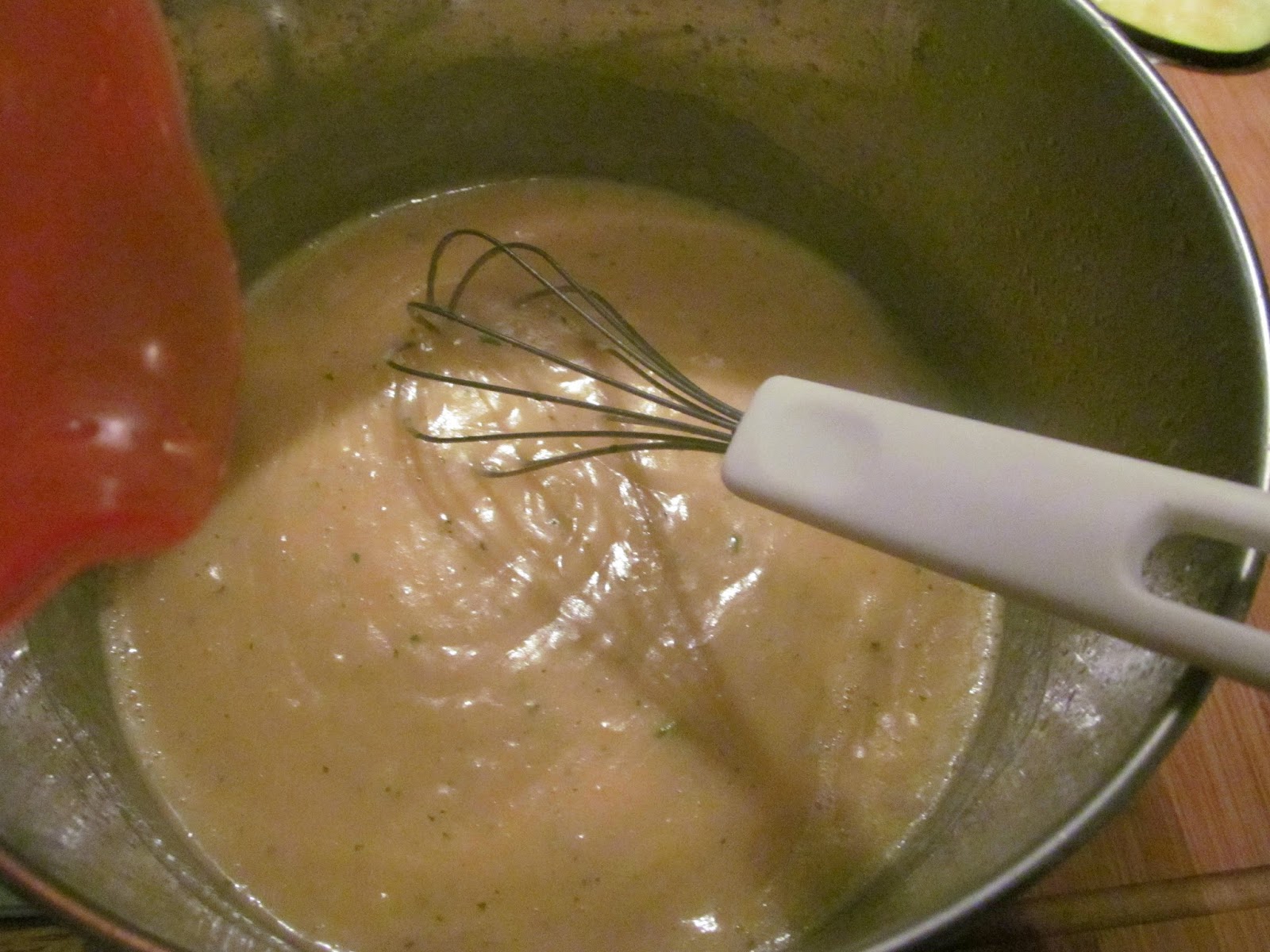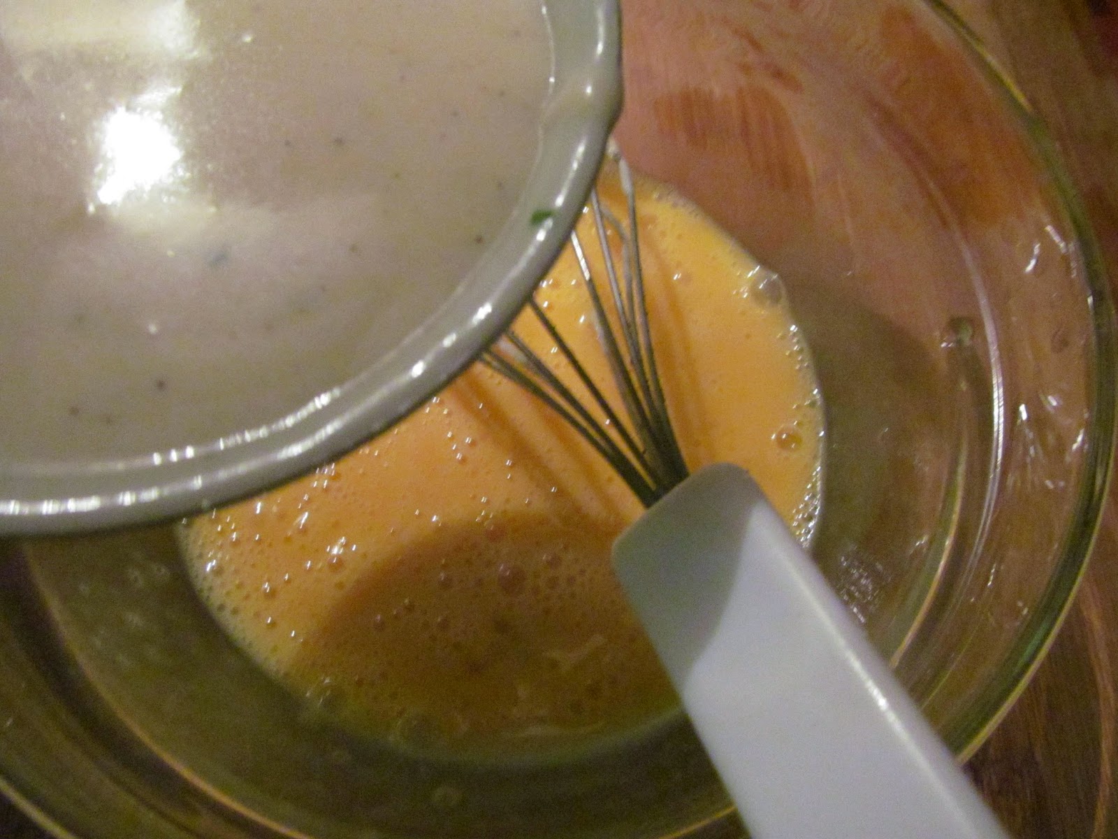 - Разбивам в купа яйцата. Много бавно и на тънка струйка, добавям 2 черпака от брашнения сос като постоянно разбърквам яйцата. Това се прави с цел, яйцата да не се пресекат от горещия сос.