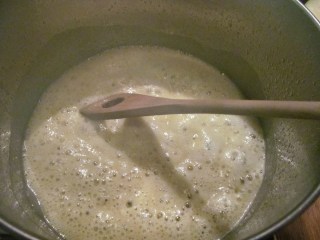 - Намалявам котлона с половин степен и добавям брашното при непрекъснато разбъркване с дървена лъжица. Пържа брашното само 2 – 3 минути, като не позволявам да залепва за дъното на тенджерката.