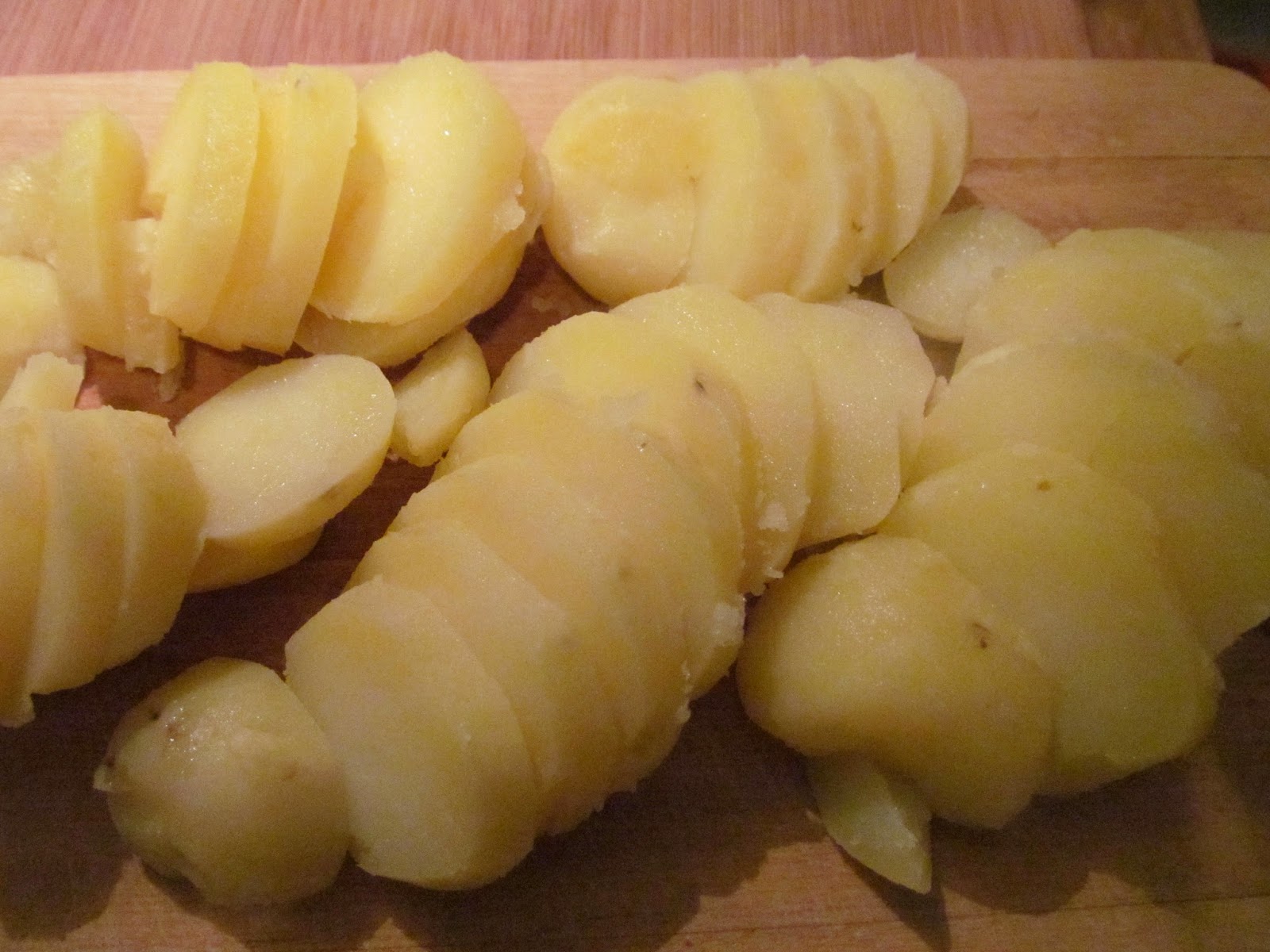- Сварените и поизстинали картофи обелвам и нарязвам на филийки.