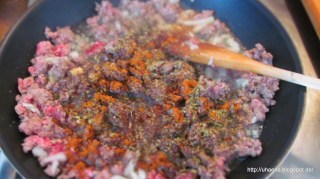 - Загрявам мазнината в тиган и изпържвам каймата, колкото да се раздели и се получат малки парченца от нея. В момента, в който си промени цвета, добавям лука, чесъна, ригана, малко сол, черен пипер и канелата.