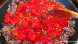 - Когато изври течността от каймата, добавям и консервата от нарязани домати. Разбърквам и оставям на средна мощност на котлона да къкри, докато изври течността и остане „на мазнина“. Минимум 5 минути.