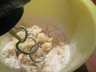 - С помощта на миксера и накрайниците за тесто, на минимална степен, разбърквам минимум 5 минути, докато продуктите се смесят и се получи тестена и гладка топка.