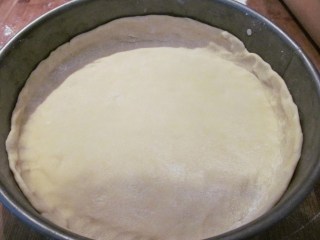 - Премествам кората във формата, която предварително съм намазала обилно с олио и с пръсти притискам двата сантиметра по стените на формата.