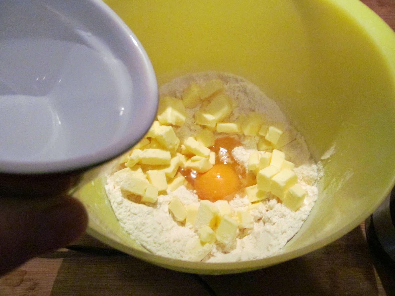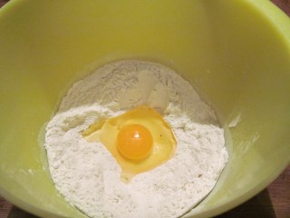- Правя кладенче в брашното и счупвам едно яйце в него.