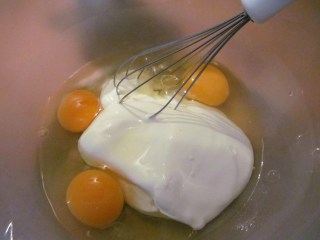 - В друга купа изсипвам Creme Fraiche /заквасената сметана/, трите яйца и разбивам.