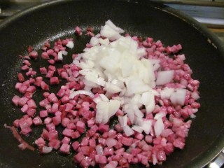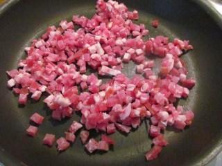 - През това време, в тефлонов тиган и без мазнина изпържвам беконът, нарязан на много ситни кубчета /около 5 мм/. Ако парчето бекон е с кожа, първо отделям кожата и чак тогава нарязвам на кубчета. Тук във всеки магазин се продават тези беконени кубчета, готово нарязани, защото почти няма ястие, в което те да не са основна съставка. Пърженето продължава, докато беконените кубчета станат леко хрупкави. Обичам аромата на пържен бекон.