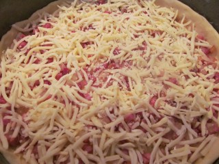 - Изсипвам и разпределям равномерно бекончетата върху тестото.