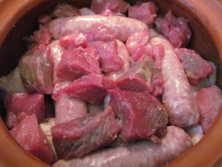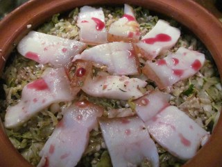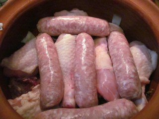 - За големите гювечи – отново ред зелева смес, но аз подреждам суровата наденичка /банския суджук и кървавица/