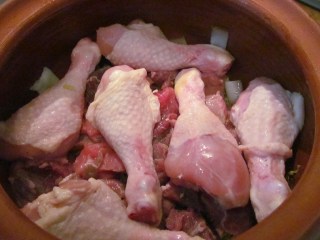 500 гр. пилешко месо /аз използвах 6 бр. долни бутчета/, ако гювеча е достатъчно голям се слага цяло пиле/