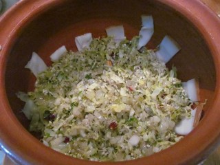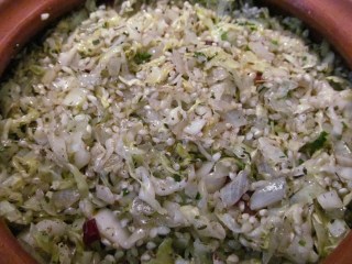 - Добавям добре изцеденото кисело зеле и започвам да раздрусвам тигана /тенджерата, ако е с капак, още по-удобно/ така че всички продукти добре да се смесят. Изключвам котлона. Зелето не е нужно да се пържи, а само да се „кавардиса“. Дано да използвам правилната дума, която чух за първи път от Елена.