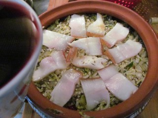 - На дъното на тенджерата, подреждам тънко нарязани лентички от половината количество сланина.