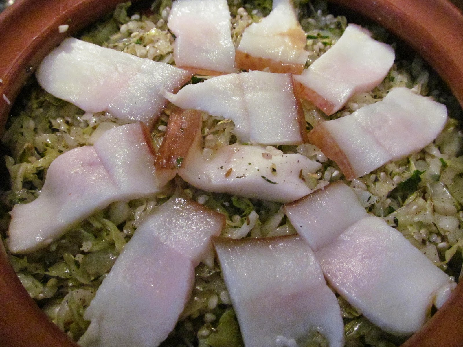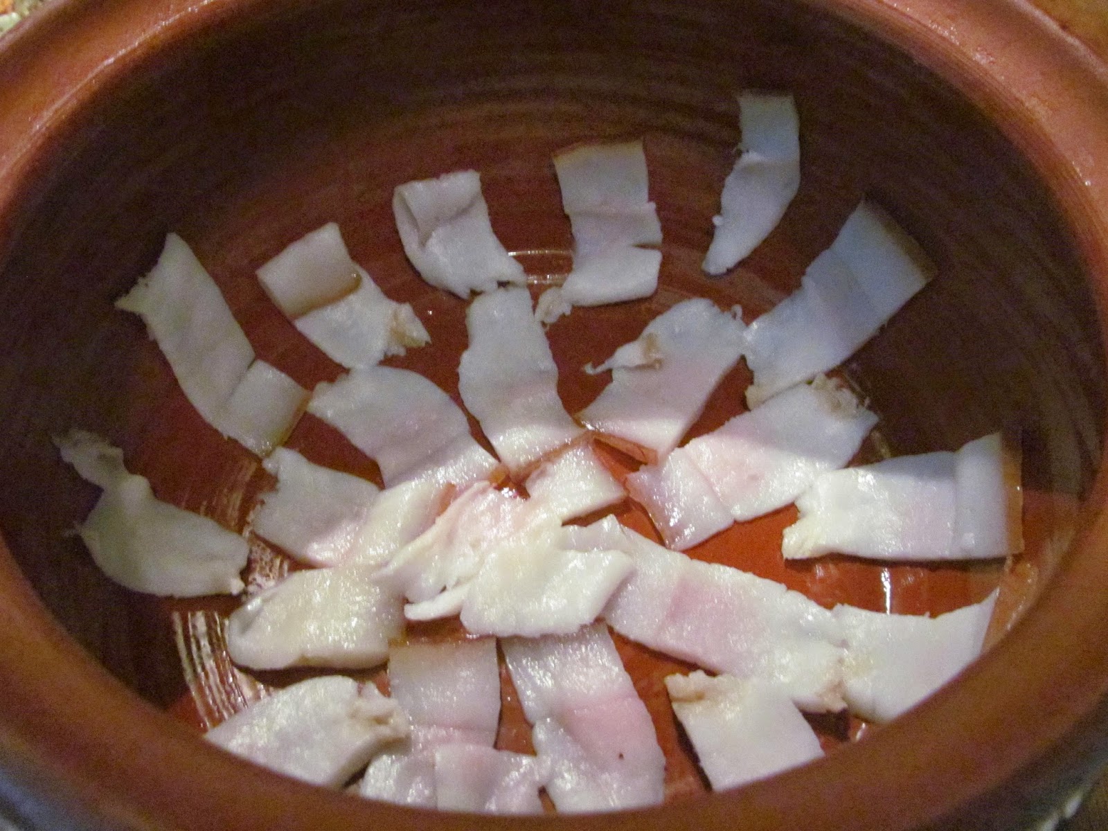 - На дъното на тенджерата, подреждам тънко нарязани лентички от половината количество сланина.