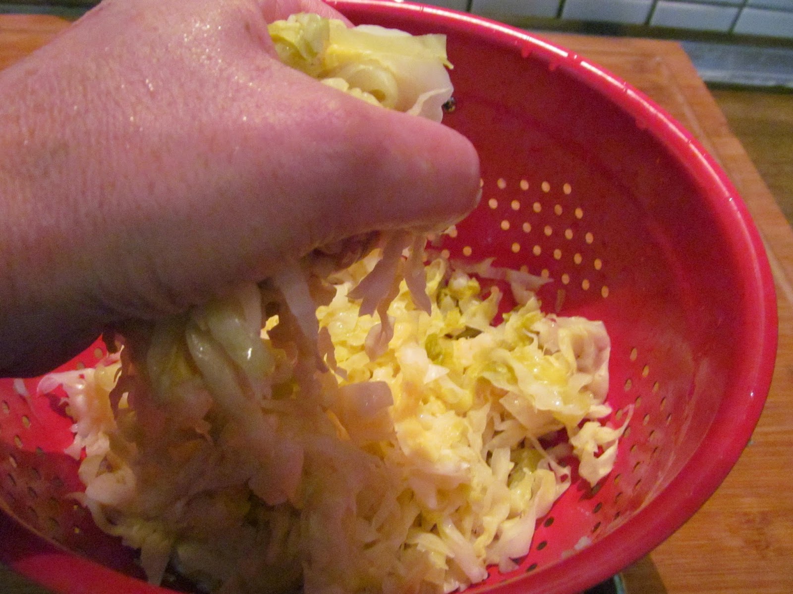 - Нарязвам киселото зеле на ситно и го оставям да се изцеди хубаво. За още по-сигурно, моят съпруг го изстисква – за да му излезе всичката течност по заръките на Елена.