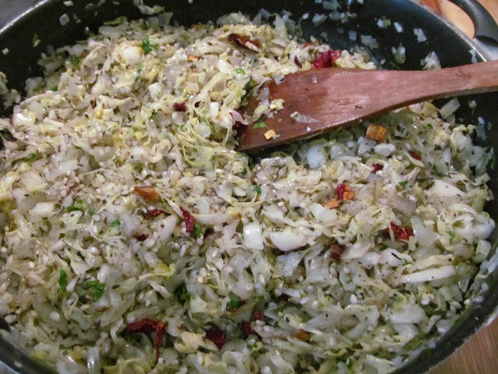- Добавям добре изцеденото кисело зеле и започвам да раздрусвам тигана /тенджерата, ако е с капак, още по-удобно/ така че всички продукти добре да се смесят. Изключвам котлона. Зелето не е нужно да се пържи, а само да се „кавардиса“. Дано да използвам правилната дума, която чух за първи път от Елена.