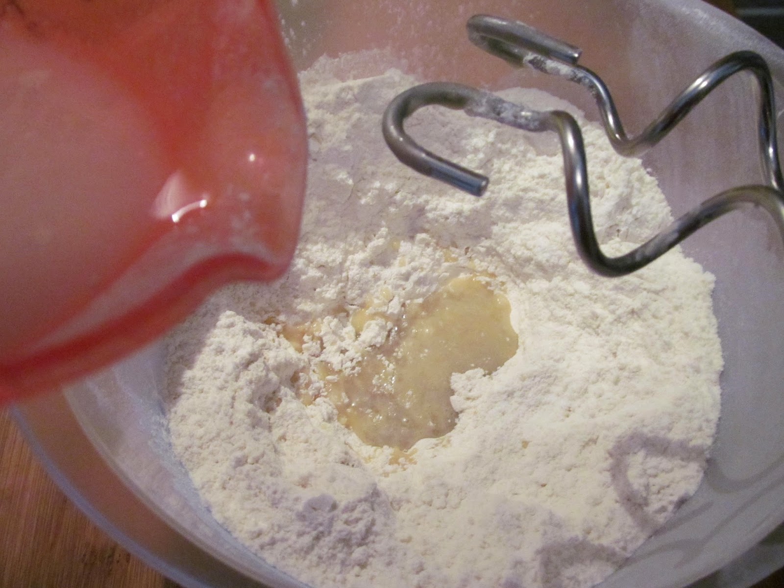 - Започвам да разбърквам с миксер, с накрайници за тесто и на минимална степен на мощност. Старая се да взимам по малко от брашното, а същевременно добавям на много тънка струйка водата, с разтворената мая.