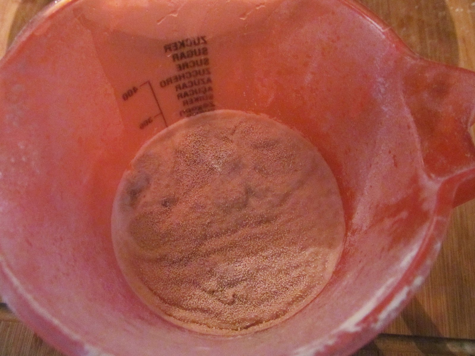 - В мерителната каничка измервам количеството, но топла вода. Използвам гореща вода от чешмата. Не използвайте от бързоварната кана, защото ще бъде прекалено гореща. Пробвайте с пръст. Като го потопите във водата трябва на пръста да му е горещо, но и да може да издържа потопен в нея. Добавям захарта и пакетчето суха мая. Разбърквам, за да се разтворят.
