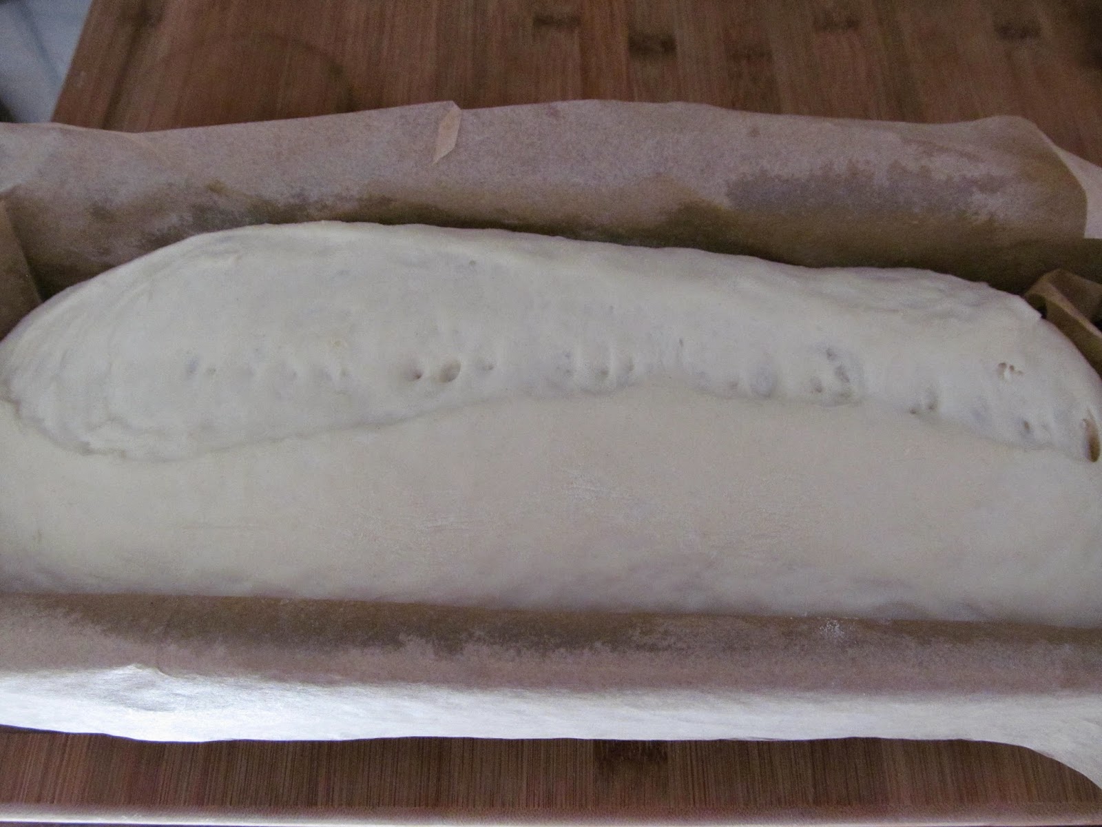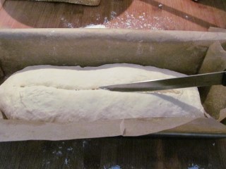 - С върха на остро ножче, разцепвам по дължина хлебчето и с дълбочина, около 1 см. Това се прави с цел, да се пукне хлябът по време на втасването и печенето, и да се изпече по-добре и сърцевината му.