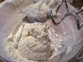 - Месенето с миксер продължава докато свърши водата и не остане брашно в купата, а тестото се е оформило на топка, залепнала по накрайниците.