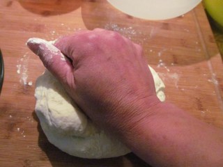 • Отпочиналото тесто, премесвам отново със съвсем малко количество брашно. Не е нужно да се добавя повече брашно, просто си набрашнявам ръцете, за да не залепва тестото по тях.