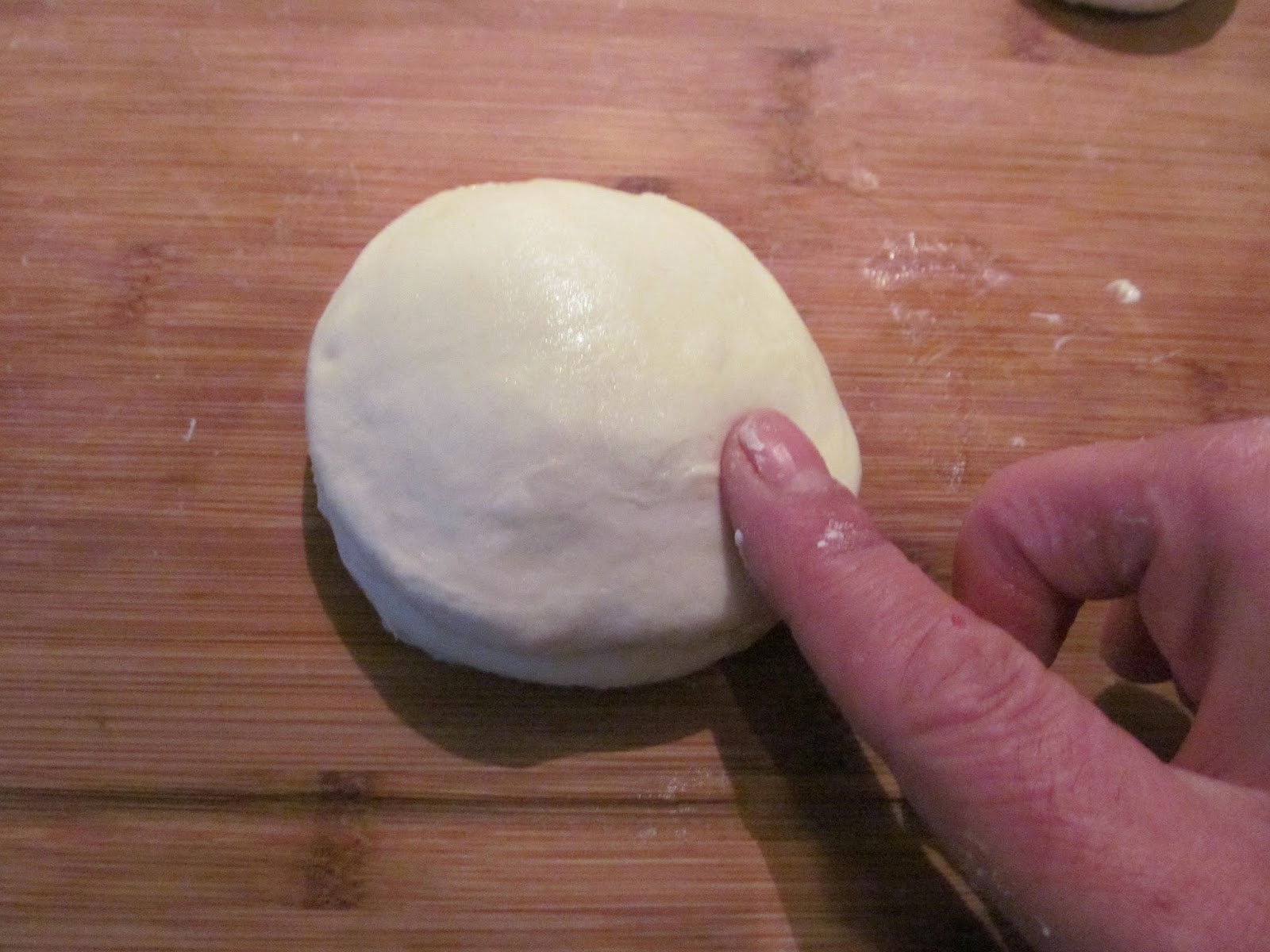 • Доомесвам тестото и за кратко на ръка, колкото да оформя на гладка топка. Ако случайно в купата, в която до сега сте бъркали тестото има малки парчета от тестото, които не са се усвоили по време на размесването, не ги добавяйте в никакъв случай към тестото – изхвърлете ги. Всяко едно добавяне на парченца тесто, след приключването на месенето, може да повлияе после на разточването на корите и да се получат множество дупки и неравности по кората.