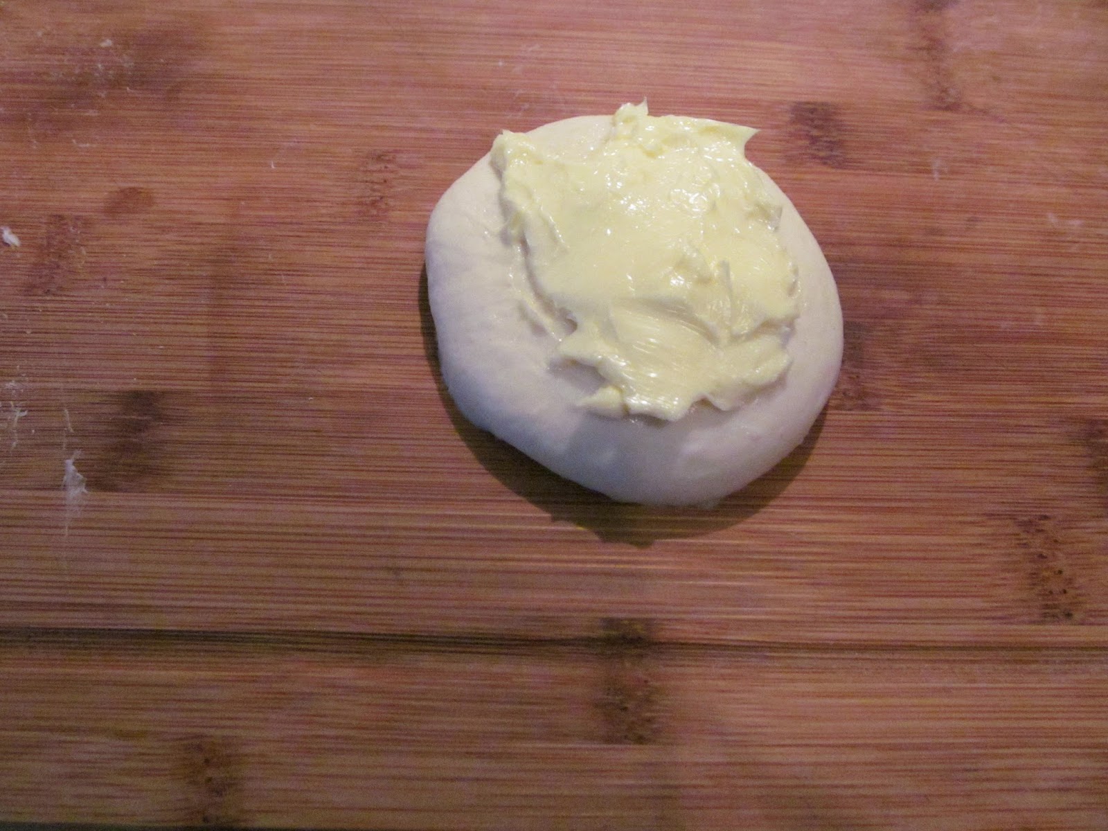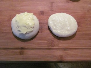 • На четири от тези кръгчета, размазвам с пръсти от добре омекналото масло.