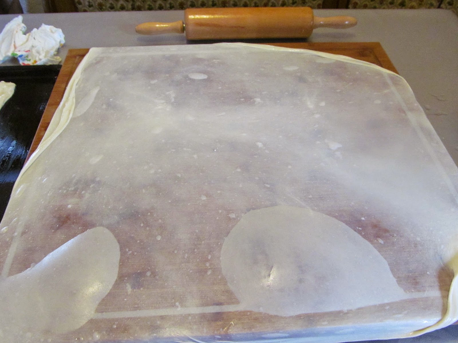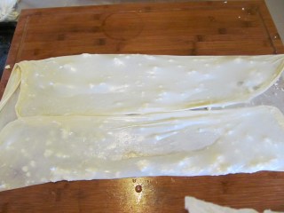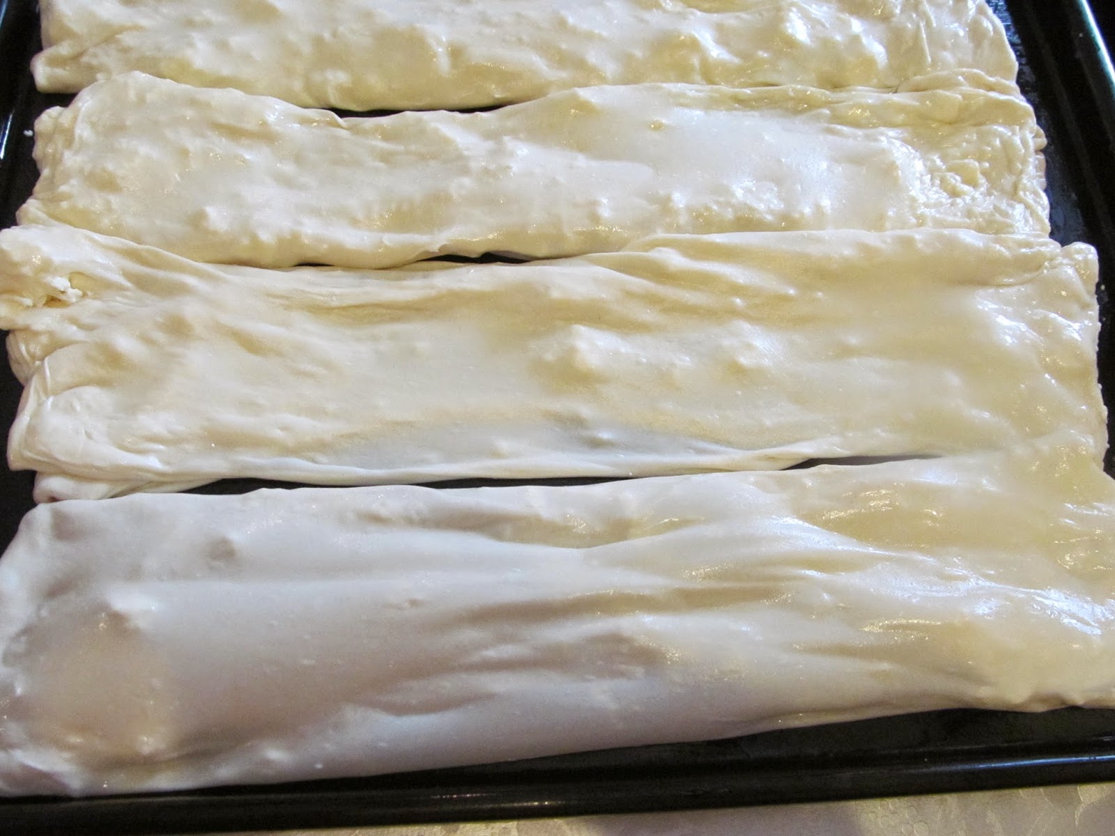 • Прибирам и страничните краища, като не ги сгъвам до средата, а само колкото да имат размера на тавата. Ако сте получили по-голям размер кори, сами преценявата колко да сгънете. Важното е да имат размера на тавата, в която ще печете.