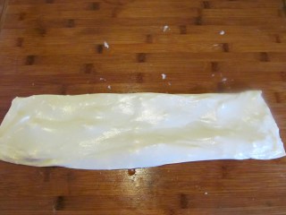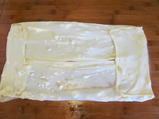 • Сгъвам още един път на половина, по дължина. Трябва да знаете, че и при самото сгъване на корите, трябва да остане въздух между отделните сгъвки. Въздухът помага на баницата да стане пухкава при печенето. А самият въздух остава между корите, когато сгъването е нежно и леко, избягвайте притискането с пръсти, а леко пускайте кората. Тя сама си намира мястото.