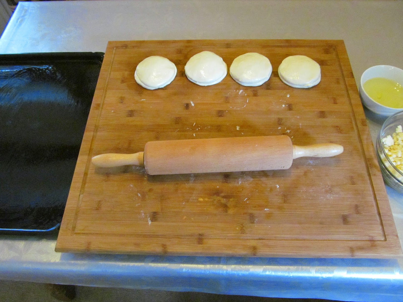 • Намазвам съвсем леко с олио всички кръгчета и покривам с кърпа. Оставям за 15 минути, за да се отпусне тестото и да се разтопи още малко маслото.