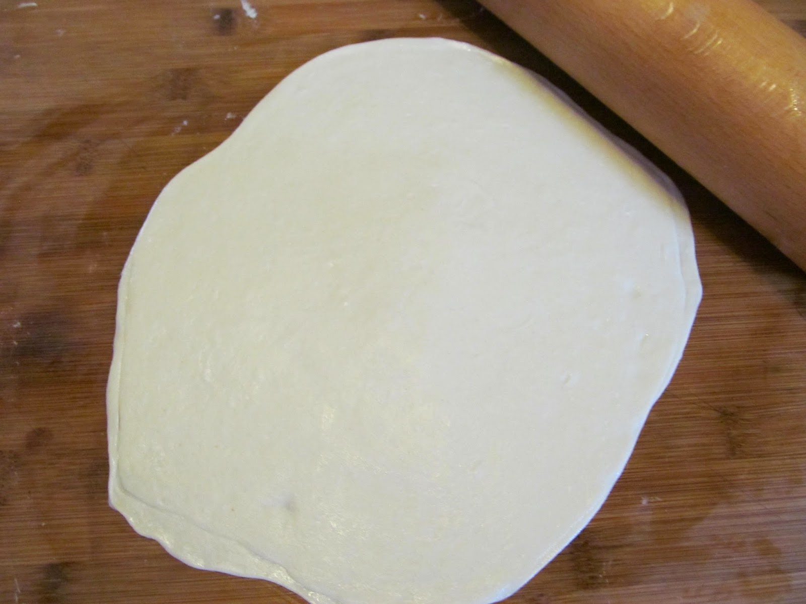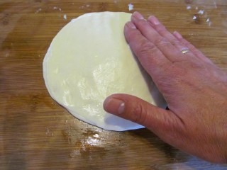 • Потапям пръсти в олиото и съвсем леко намазвам повъархността, на която ще правя корите. Не се използва брашно повече. Само мазнина. С помощта на пръстите притискам първото кръгче, така че да се разтегли до размер на чинийка за торта. Притискането е от средата към краищата, като в средата натиска е съвсем малък, а в краищата малко по-силен. По принцип при въртенето на корите, средата винаги става по-тънка, а краищата остават по-дебели. Поради тази причина е по-добре да не се разточва кората в средата.