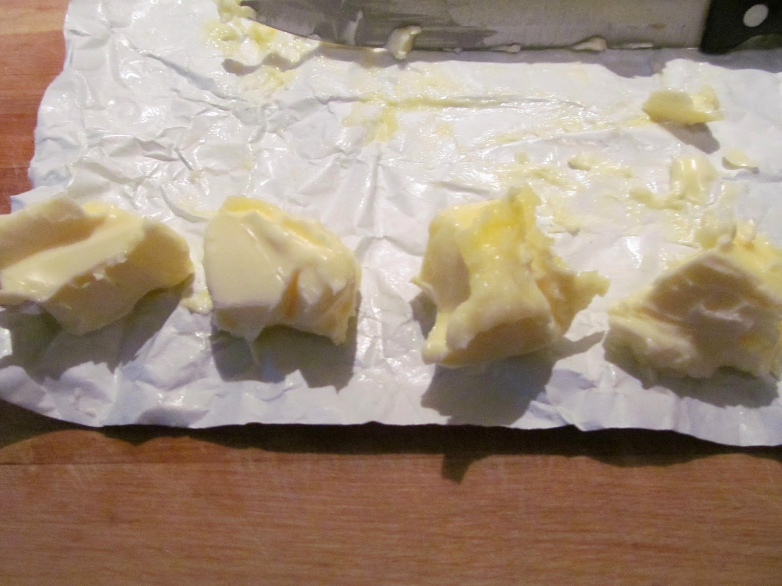 • Разделям си маслото на 4 на брой малки кубчета. Маслото трябва да е със стайна температура, много добре омекнало.