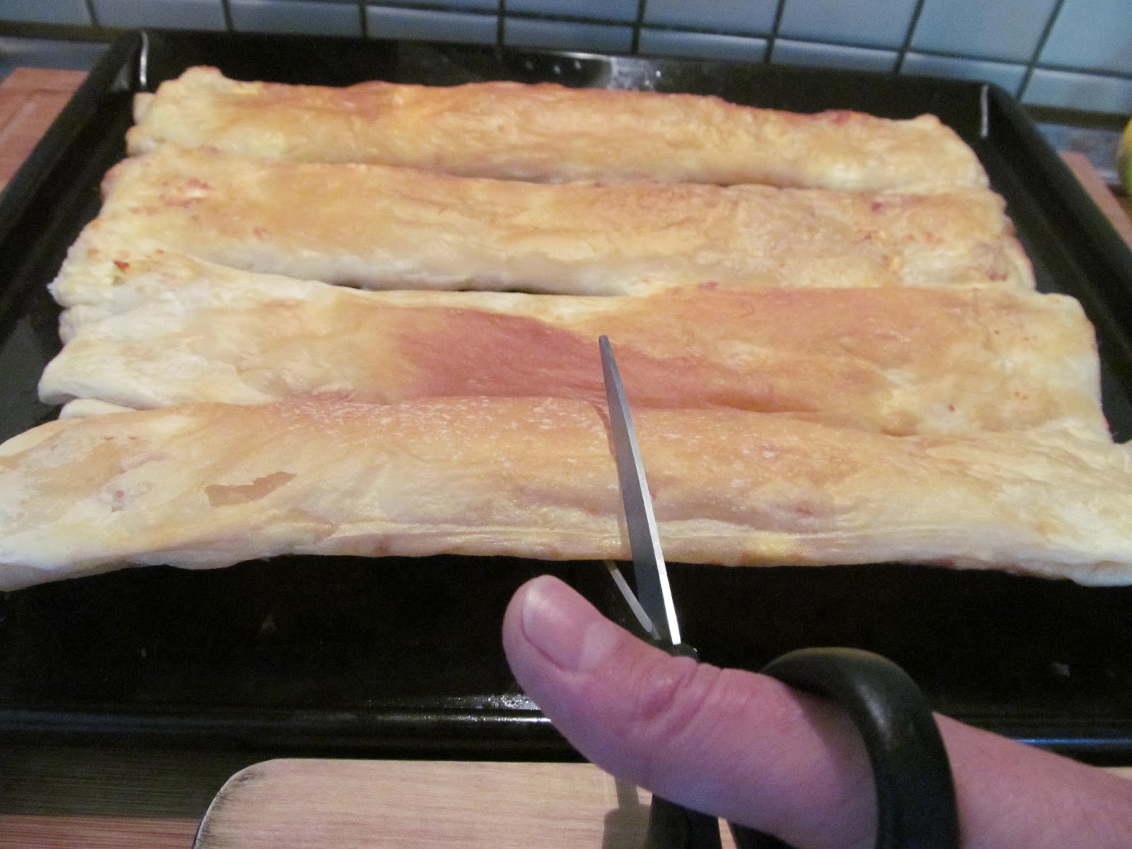 • Когато преценя, че баничките са готови – изваждам от фурната. Напръсквам леко със студена вода и още топли ги нарязвам на половина с помощта на ножица. Имам си една такава за употреба само в кухнята.