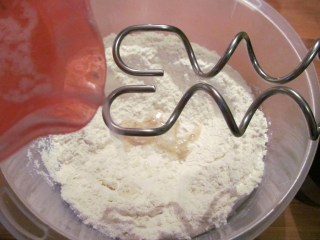 • Когато водата свърши, продължавам разбъркването, докато брашното свърши. Ако случайно тестото е все още много рядко и не се е оформило на топка, около накрайниците на миксера, добавете бавно още малко брашно.